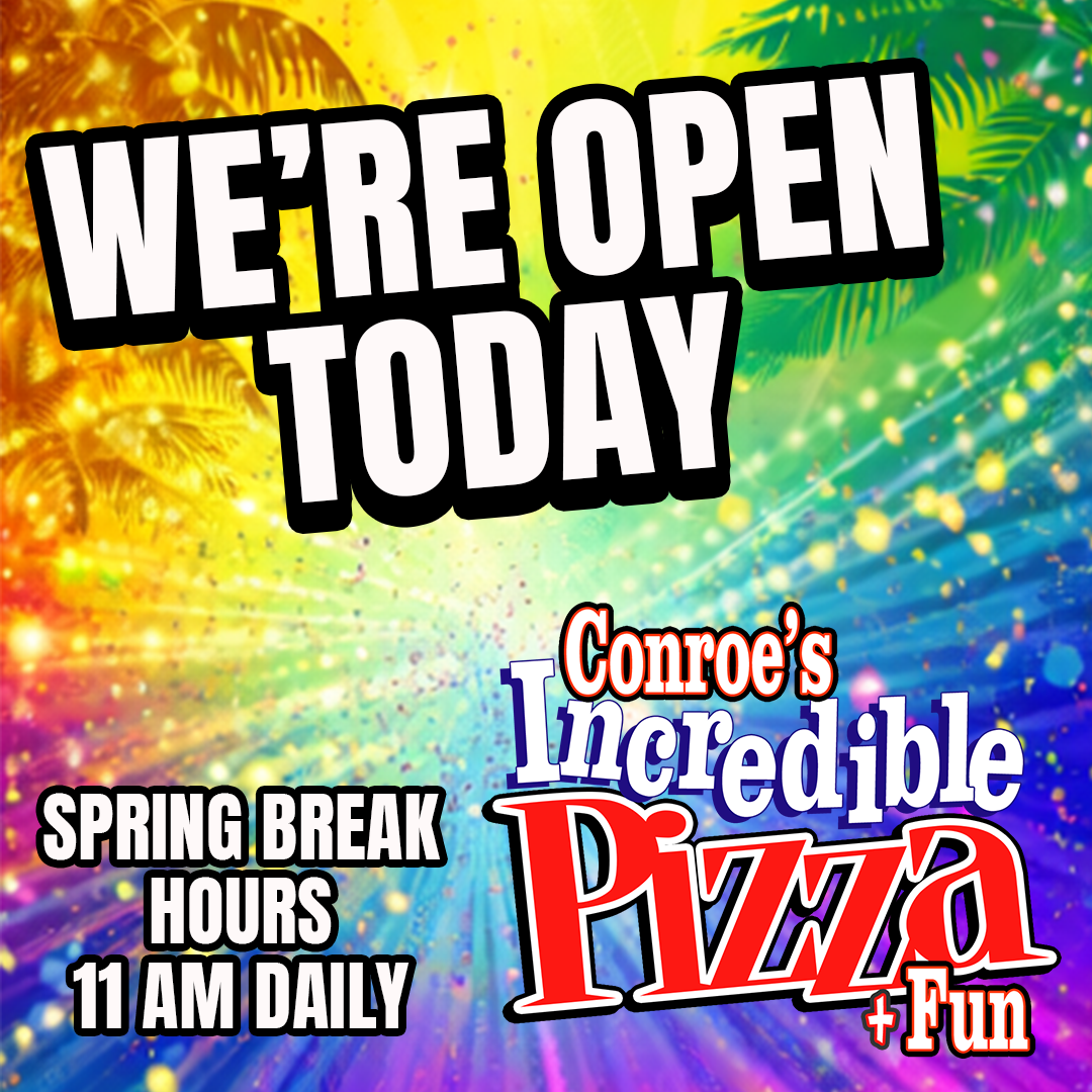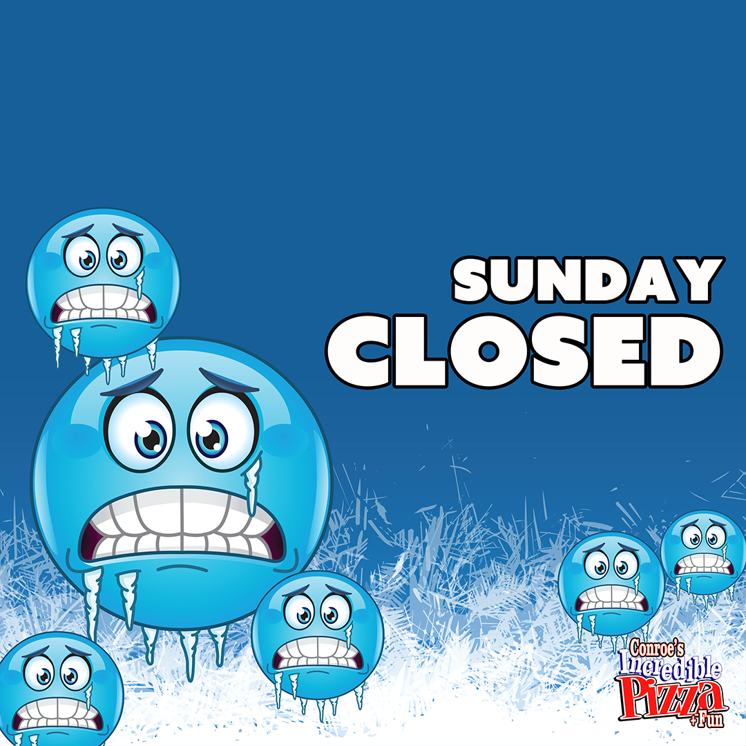 Due to the impending freeze and to ensure the safety of our guests and team members, Conroe’s Incredible Pizza will be closed on Sunday. We will reopen Tuesday at 11:00 AM and resume our regular hours. For the latest updates, please be sure to follow us on Facebook.