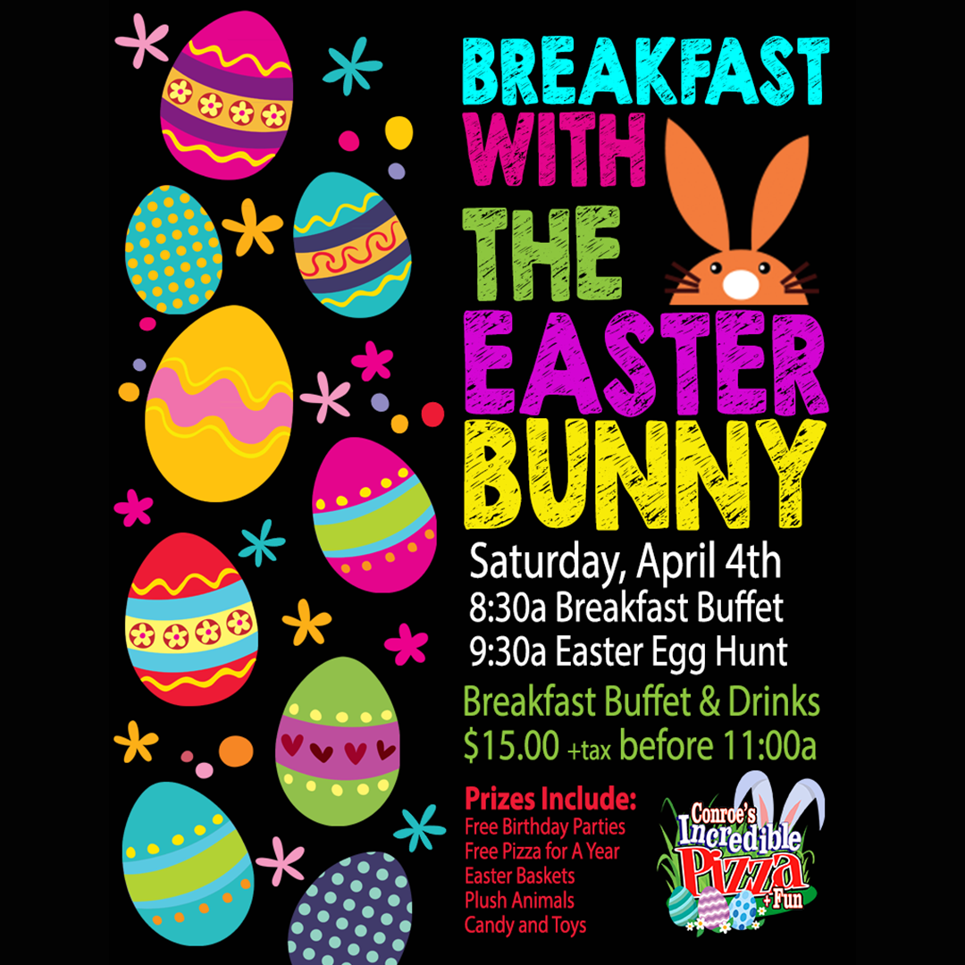 The Easter Bunny is hopping into Conroe’s Incredible Pizza — and he’s bringing breakfast AND prizes! 🐰🎉 Don’t miss the sweetest morning of the season!
