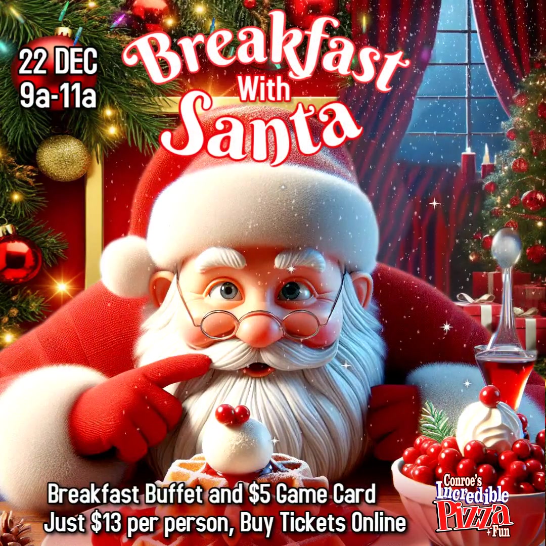 Santa’s secret recipe? A stack of joy and a side of sprinkles! 😋Dec 22 | 9–11 AM for Breakfast with Santa at Conroe’s Incredible Pizza!You bring the wish list — we’ll bring the whipped cream!🎟️ $13 per person + $5 Game Card🎅 Tickets are flying faster than Rudolph!👉 Grab Yours Herehttps://parties.ipcconroe.com/package/main