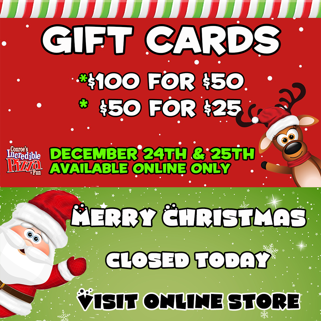 Things are heating up at the North Pole — and at Conroe’s Incredible Pizza!🦌🔥 Rudolph’s Red-Hot Gift Card Sale lands Christmas Eve & Christmas Day, ONLINE ONLY!Last Chance… this deal is too hot to hoof past! 😉