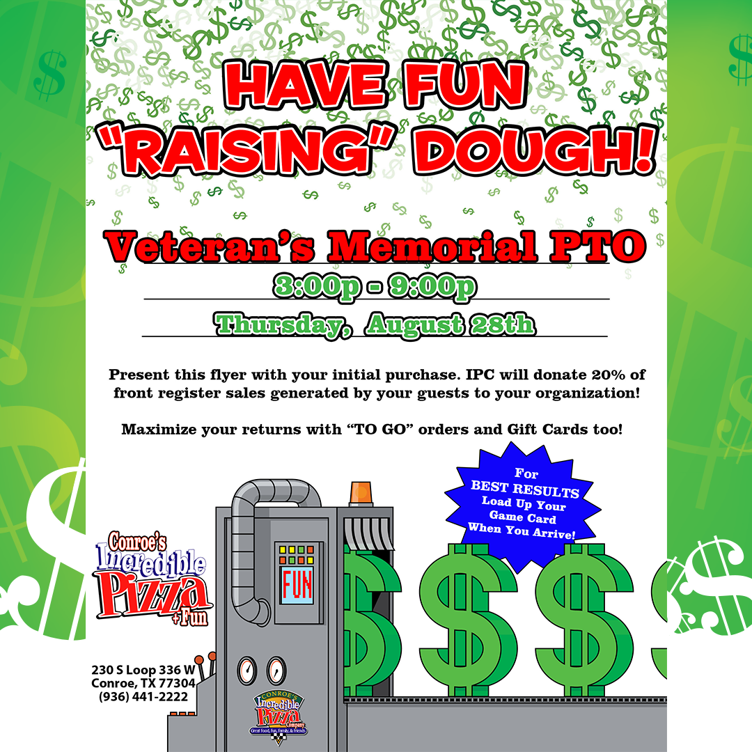 🍕 Let’s Turn Pizza Into $$Bucks$$ Join our school’s PTO at Conroe’s Incredible Pizza on Thursday, August 28th, 3–9 PM. 20% of sales with our flyer will help support Veteran’s Memorial Intermediate. Bring the family, eat, play, and give back!
